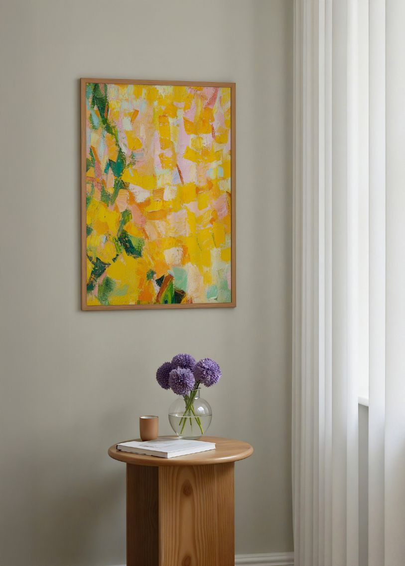 Vivid strokes of lemon, lime and turquoise radiate outward like beams of sunlight, creating a magical aura. Great for a kitchen or creative space, it sparks vibrancy and joy.
