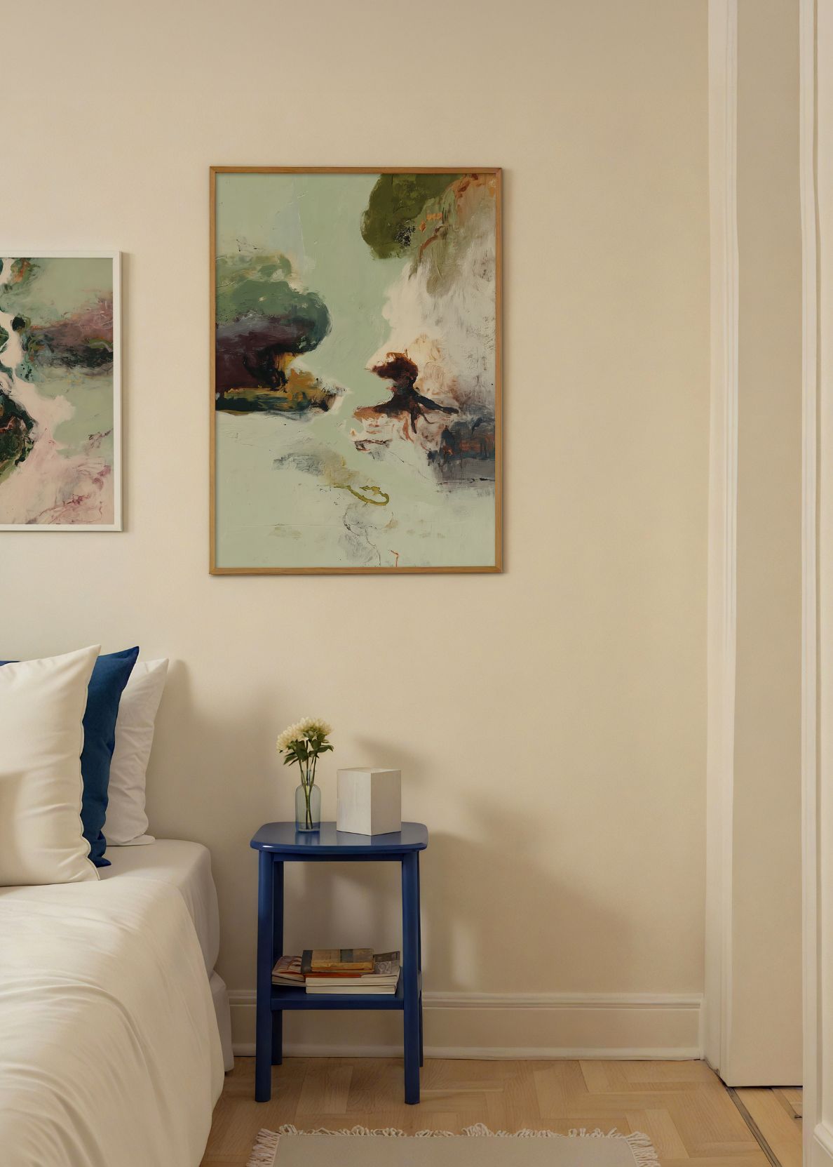 A wild and organic composition where earthy tones and textured layers evoke the raw beauty of nature. The contrasts of deep rust, olive green and soft mint create a grounded, yet expressive visual rhythm. Perfect for a living room or hallway that invites depth and contemplation.