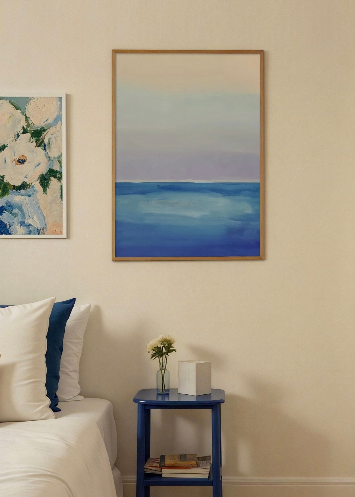A calm horizon divides sea and sky, rendered in bands of blue, teal and soft peach. Great for a dining room or bedroom, it adds balance and expansive calm.