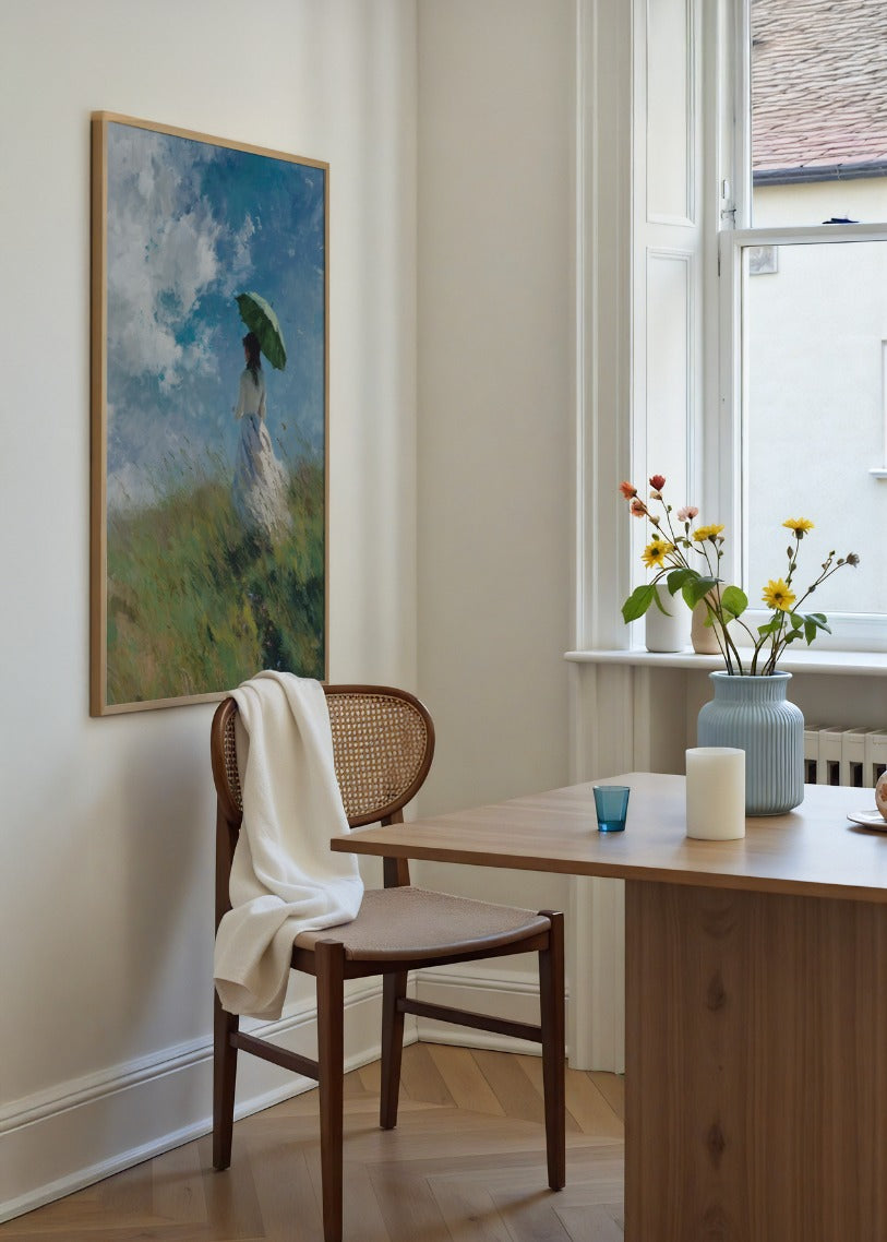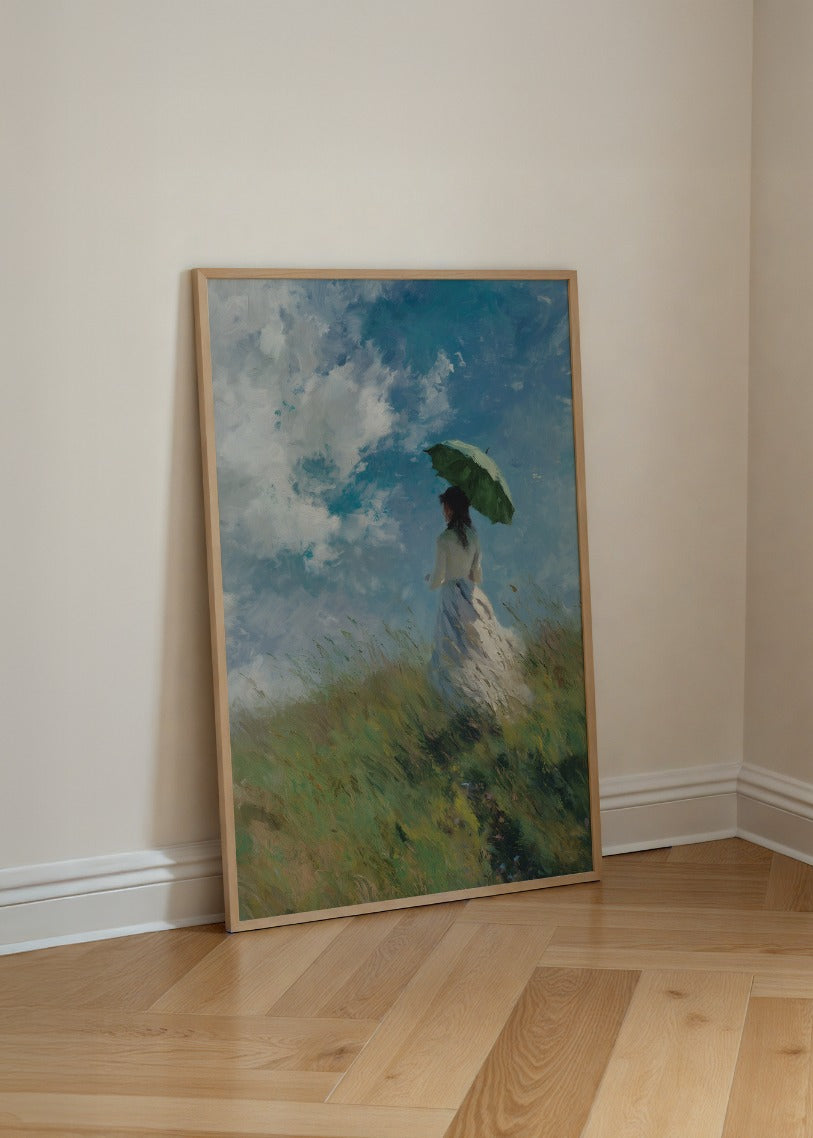 This impressionistic artwork captures a moment of quiet reverie in a sunlit meadow. Soft brushstrokes and vivid hues of blue and green evoke a dreamy, peaceful atmosphere. Perfect for a bedroom or reading nook, it adds a poetic charm and sense of gentle escape to the space.
