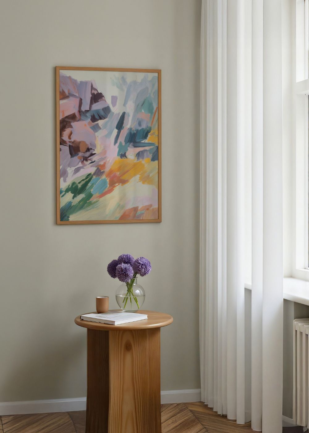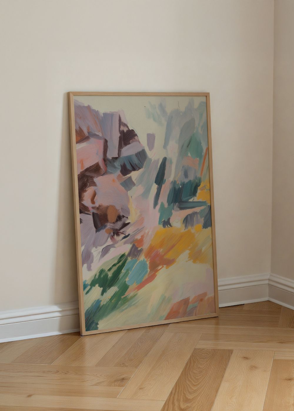 This abstract landscape captures the essence of nature through vibrant strokes of green, blue, ochre, and lavender. The composition feels both dynamic and grounded, like sunlight dancing across a hillside. A perfect piece to bring warmth and earthy elegance into a living room, hallway, or reading corner.