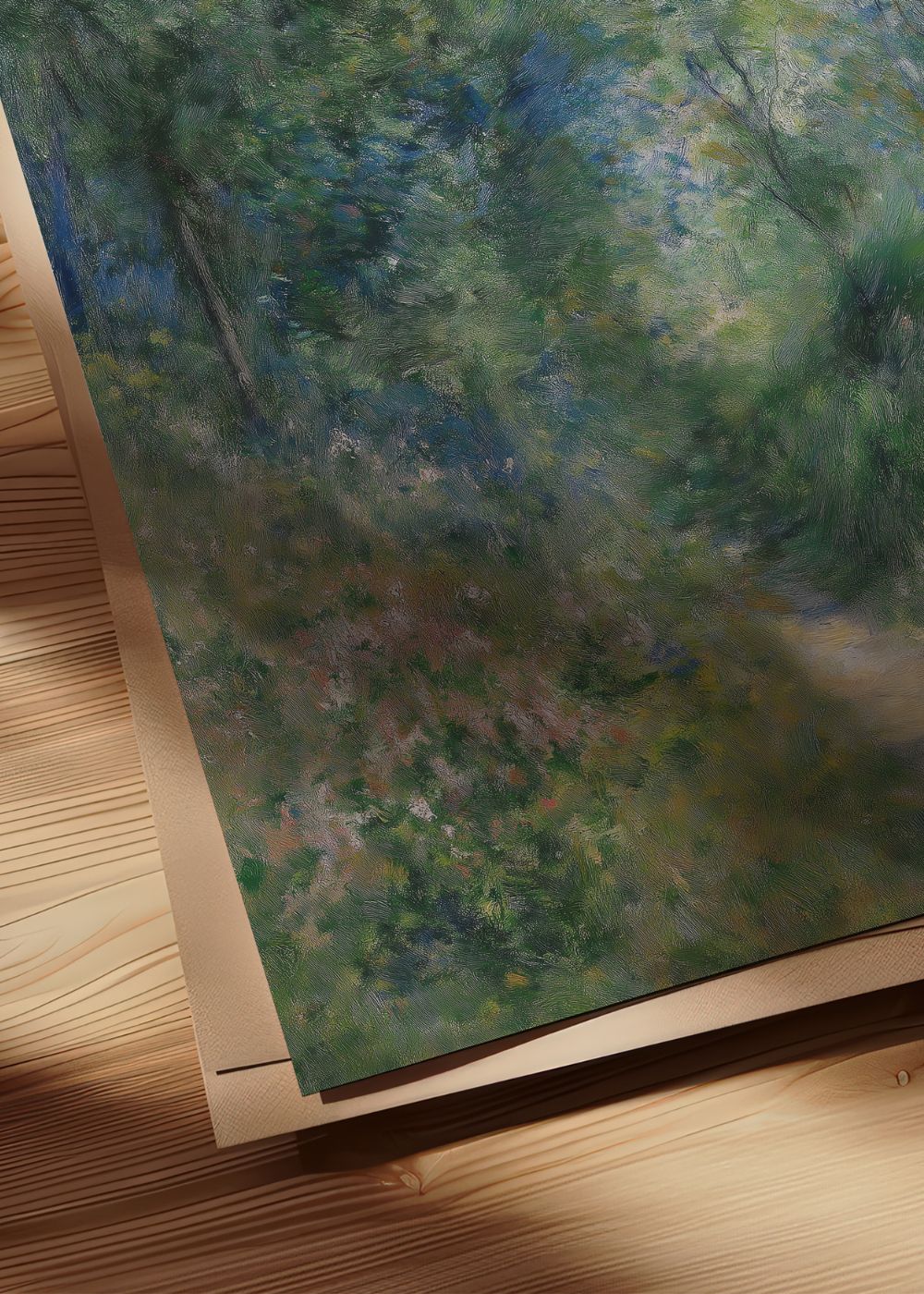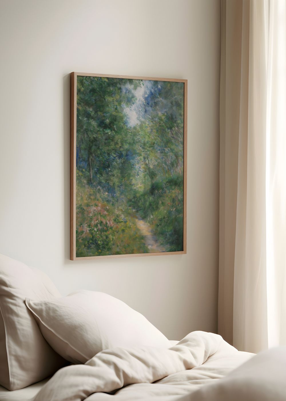 A sun-dappled forest path winds through soft greenery and scattered wildflowers, inviting you into a world of peace and wonder. Gentle brushstrokes in shades of green, blue, and soft pastels create a dreamy woodland atmosphere. Perfect for a bedroom or reading nook, it brings a sense of calm and natural magic.
