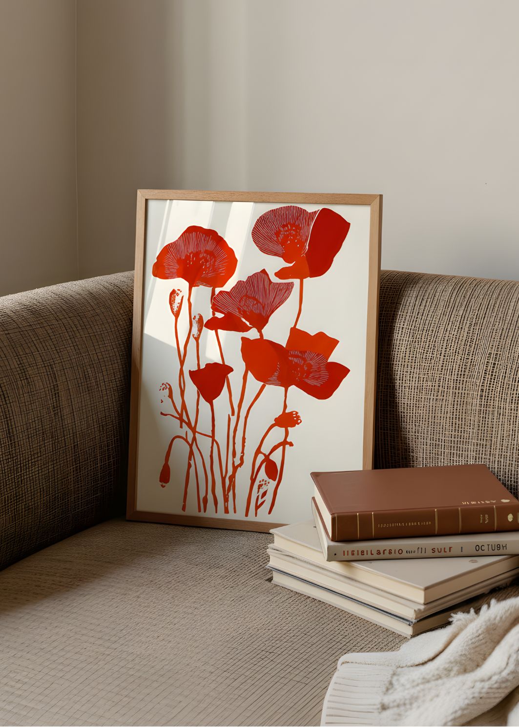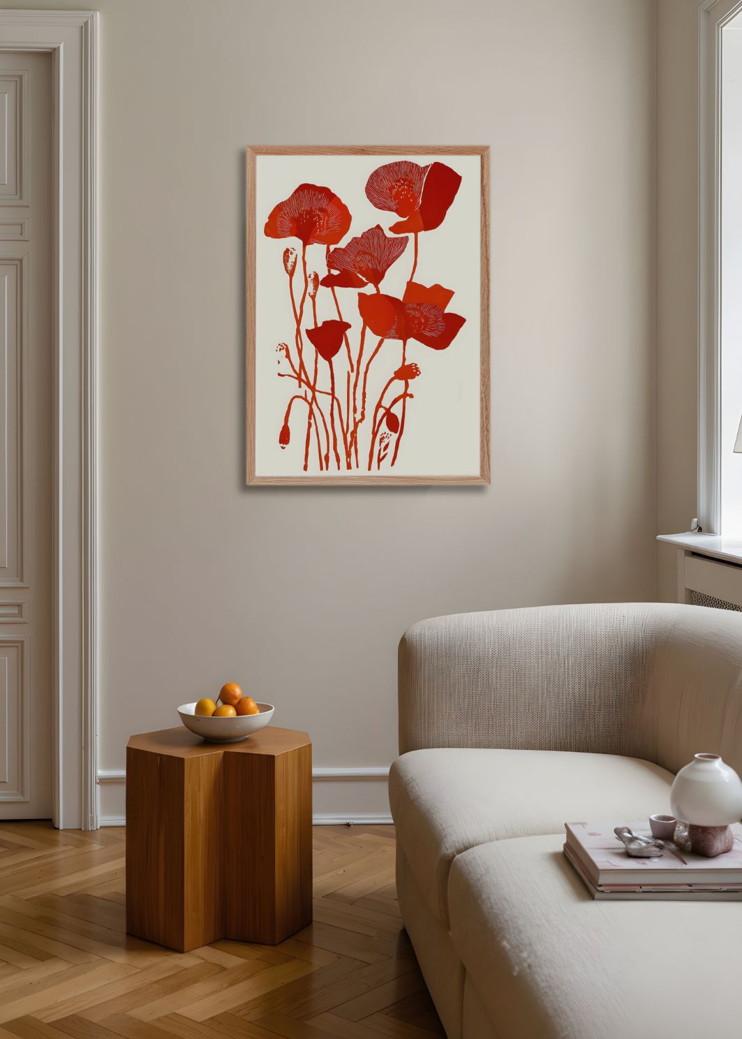 This elegant composition features a striking bouquet of red poppies rendered in a stylized, graphic form. With strong lines and vibrant hues, the artwork celebrates the beauty and simplicity of nature in full bloom. The clean background enhances the floral forms, making it a powerful visual statement, ideal for brightening up a kitchen, hallway, or any modern living space.